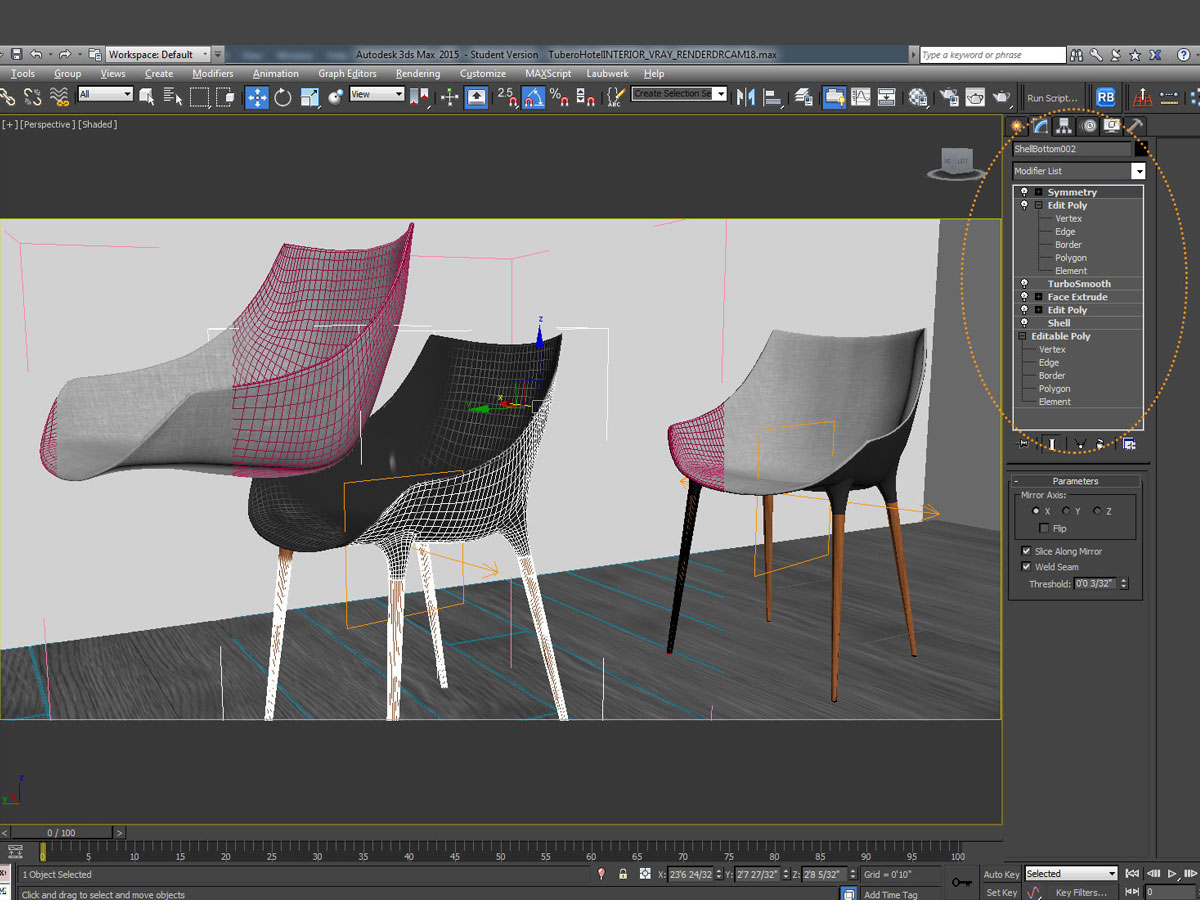 Original file exported from Rhino into 3ds Max for additional modeling, texturing and lighting.