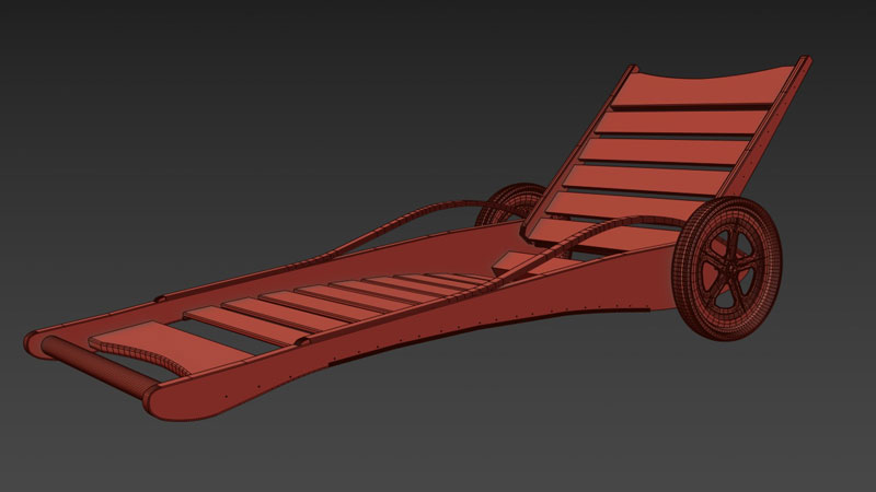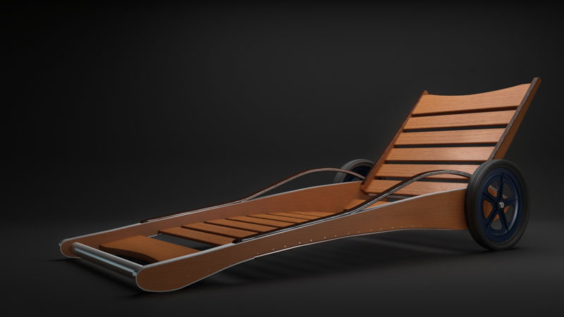 I was asked to create a 3D model of this lounger to be used in the client's presentations. They also planned to have the main parts CNC'd, so the dimensions and hole locations had to be exact. After taking measurements and photos of the piece, I created the line drawings in AutoCad then imported the DWG file into 3dsMax for modeling and texturing.