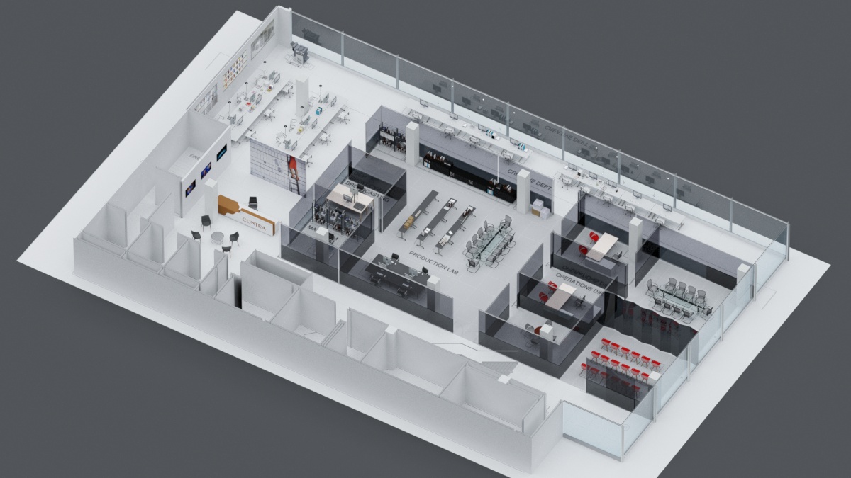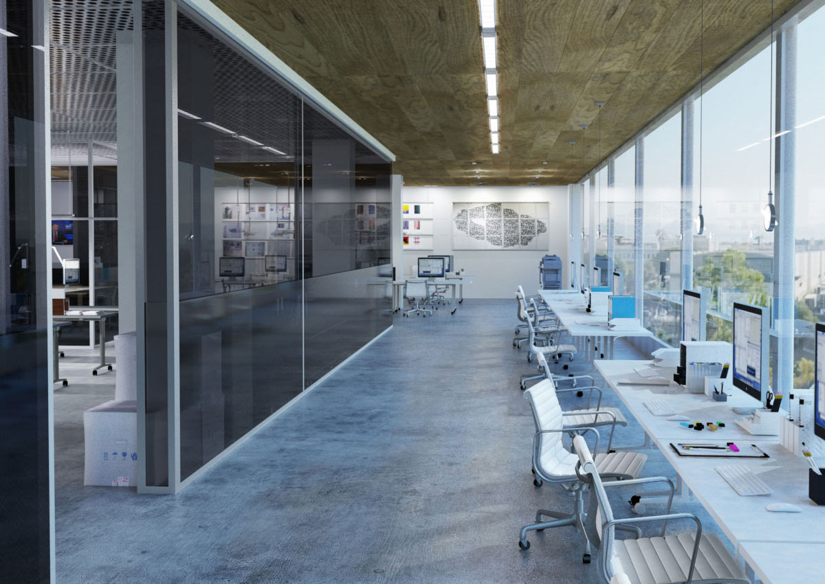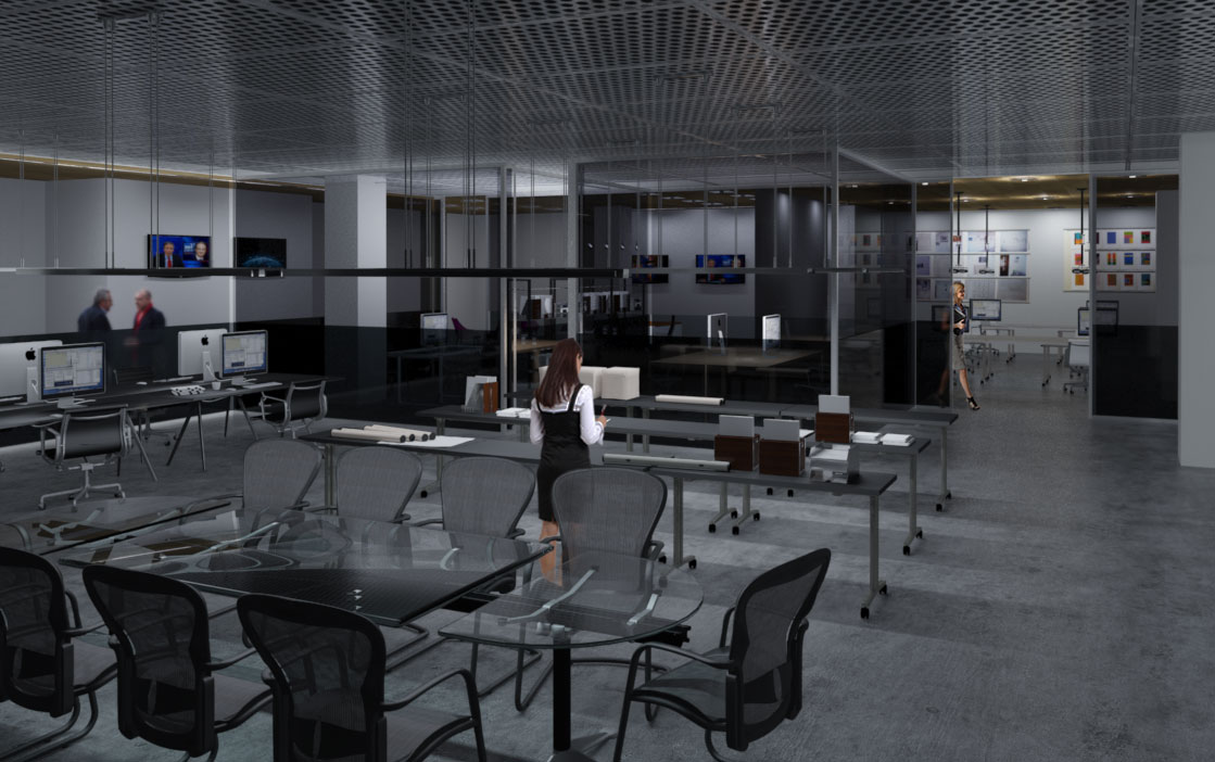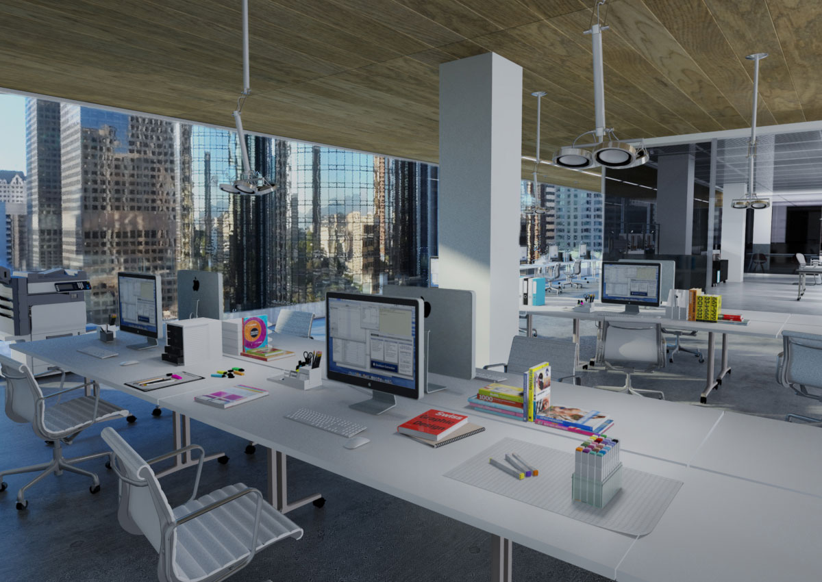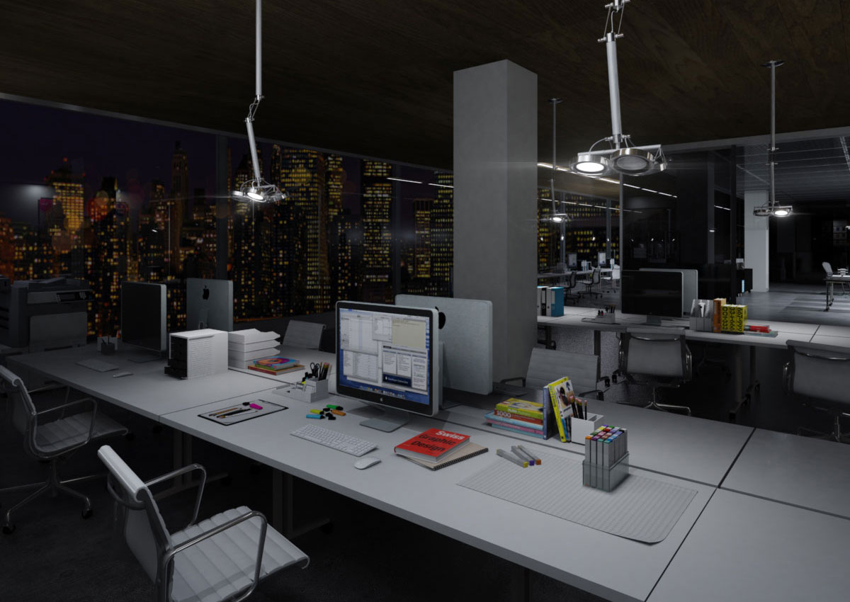 Another of my earlier works. The amount and varying types of glass coupled with the open concept work spaces were a welcomed challenge in my learning process. Balancing the lighting in the various areas while maintaing a sense of cohesion was my goal. I wanted the space to speak for itself, so rather than visually clutter the already packed scenes I decided to forgo adding tons of entourage and included them only where needed for a sense of scale and depth. I was inspired by the thought of someone working a solitary late shift and rendered a night scene to sontrast with the daytime images.